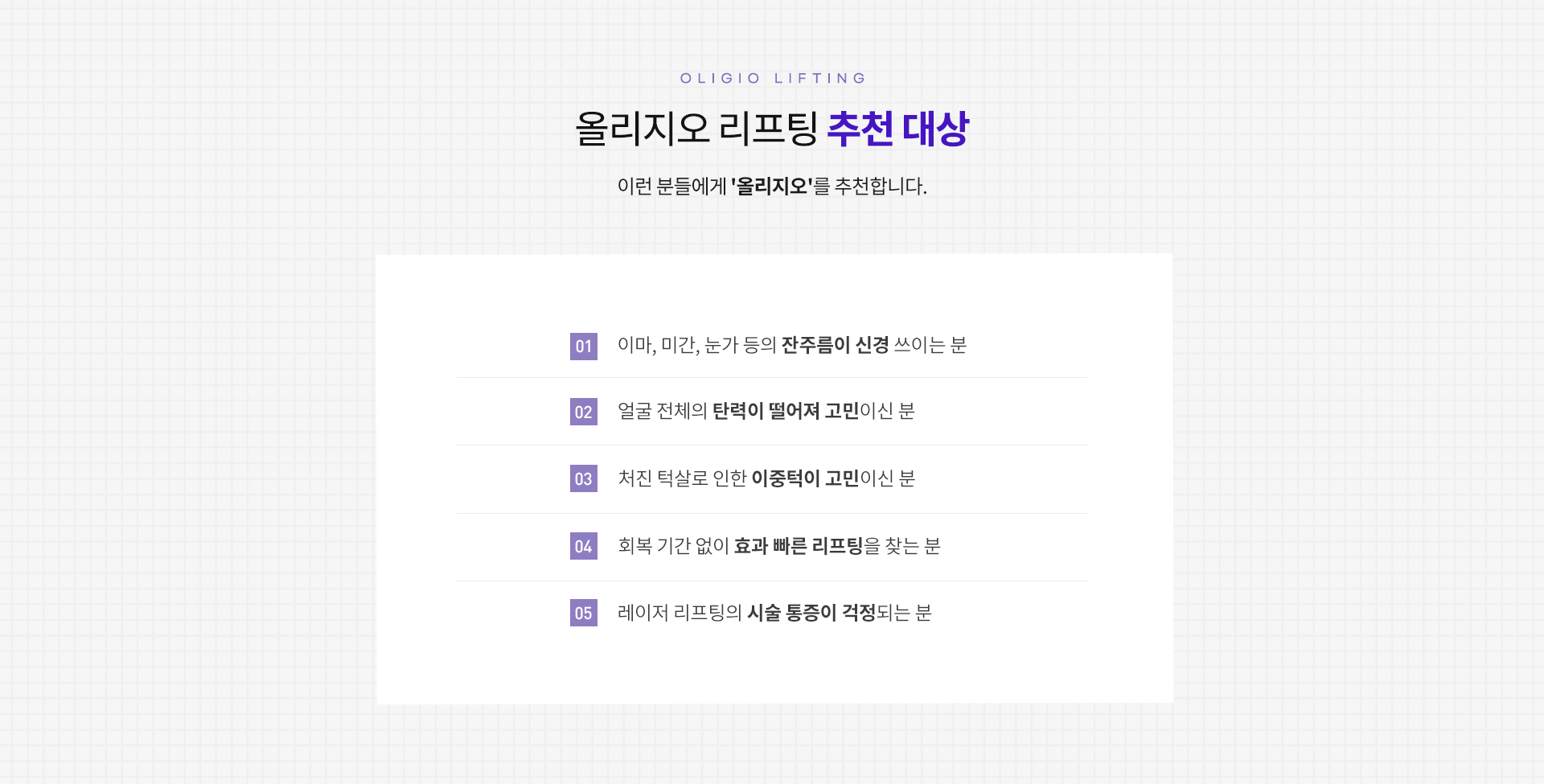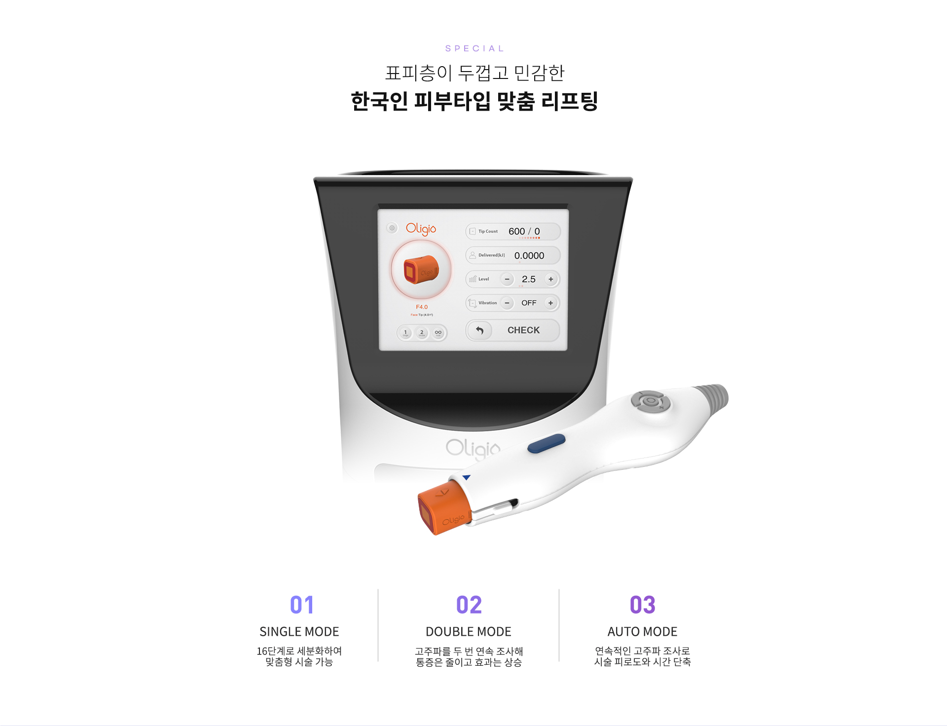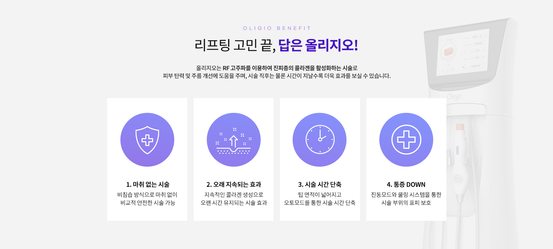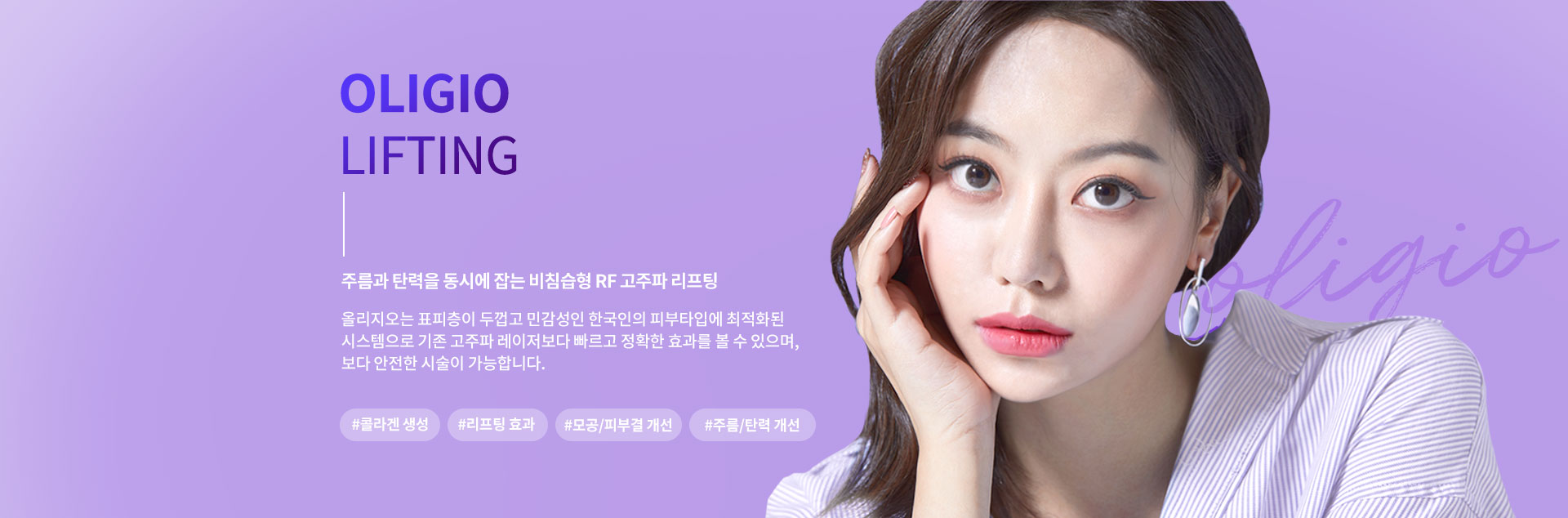 올리지오는 고주파를 이용하여 진피층의 콜라겐을 활성화해 피부 탄력 및 주름 개선에 도움을 주는 시술입니다.