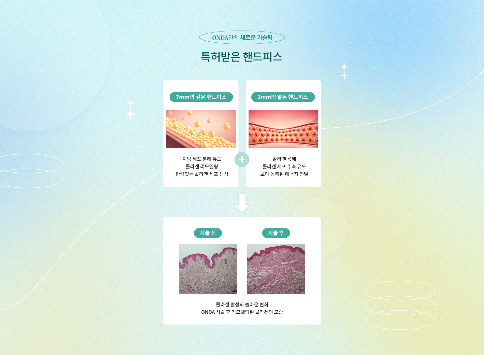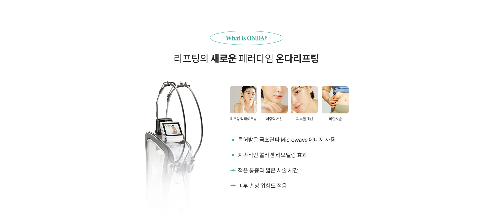 기존 리프팅은 표피를 통해 열을 전달하지만, 온다 리프팅은 마이크로 웨이브(극초단파) 에너지를 사용해 피부 겉면의 자극은 줄이고 진피 속 깊숙이 직접 열을 전달합니다. 속에서 60도 이상의 열을 발생시켜 콜라겐 생성, 리모델링, 타이트닝, 지방분해 효과를 동시에 이끌어내는 스마트한 시술입니다